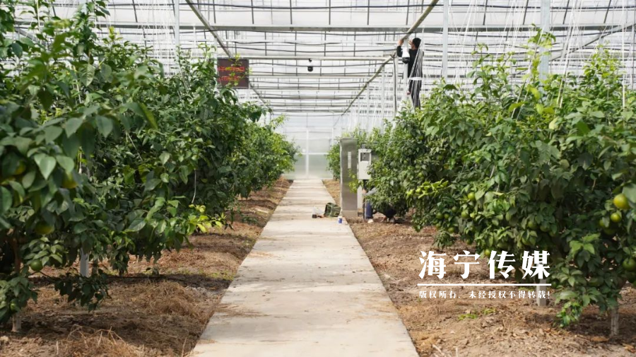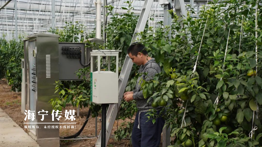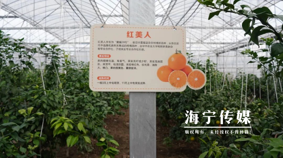 湾畔山间,橘沁心甜。海宁市农业科技创新园位于黄湾镇黄湾村,毗邻高阳山、凤凰山,生态环境优良。红美人生长在高标准大棚内,配备自动化水肥系统,卷膜、遮阳、防虫、防鸟网等设施设备,由数字化平台监控红美人生长情况。