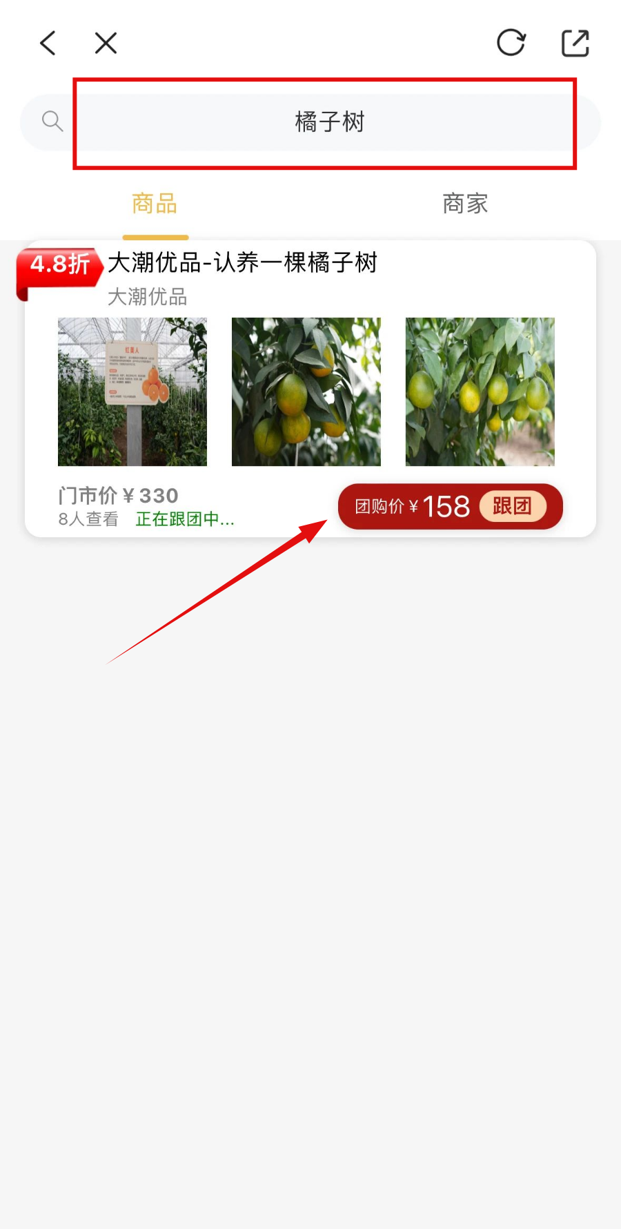 在首页下方点击进入“潮豆豆”,在搜索栏内输入关键词“橘子树”即可获取链接,用户在认养链接下单即为认养成功。