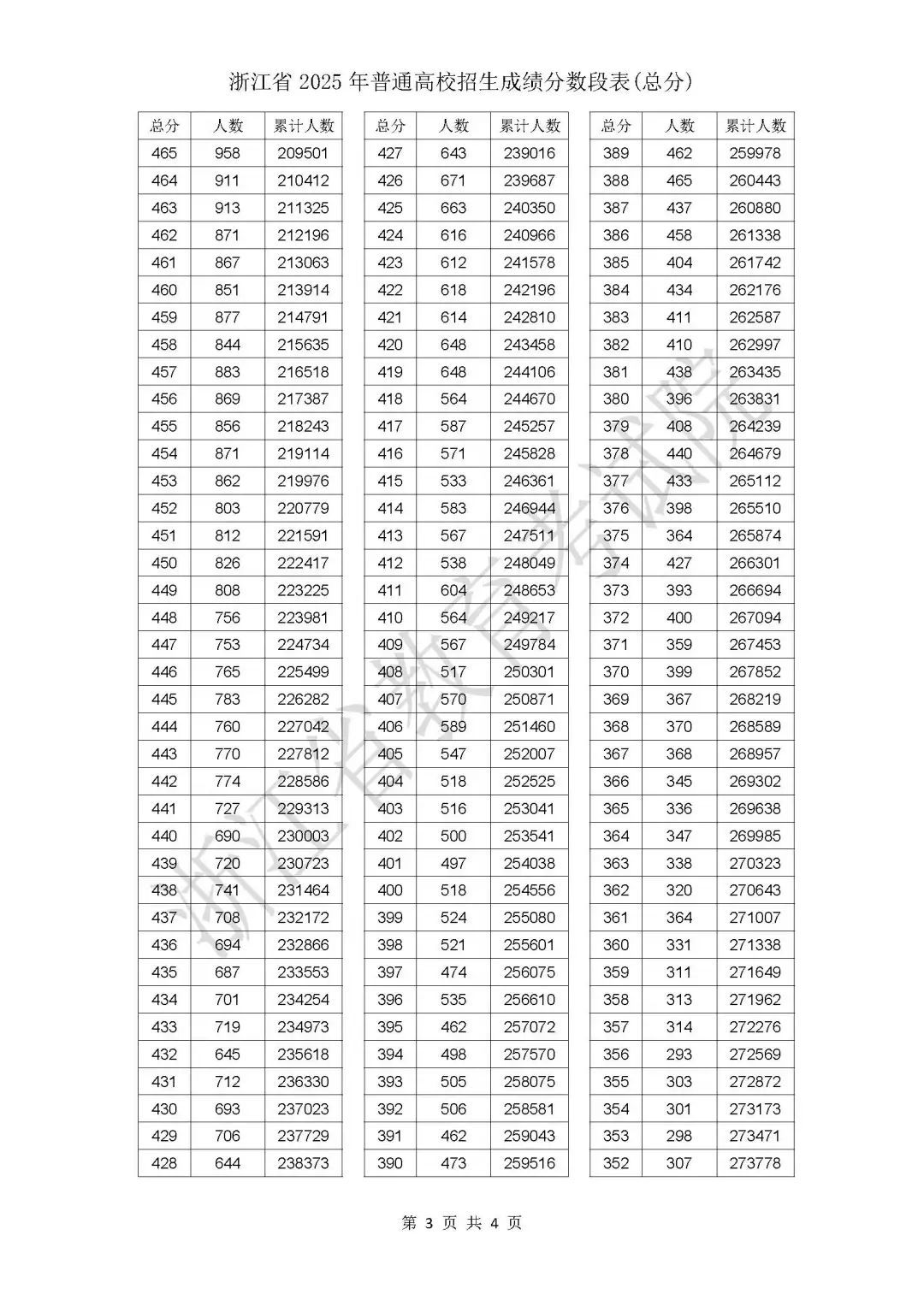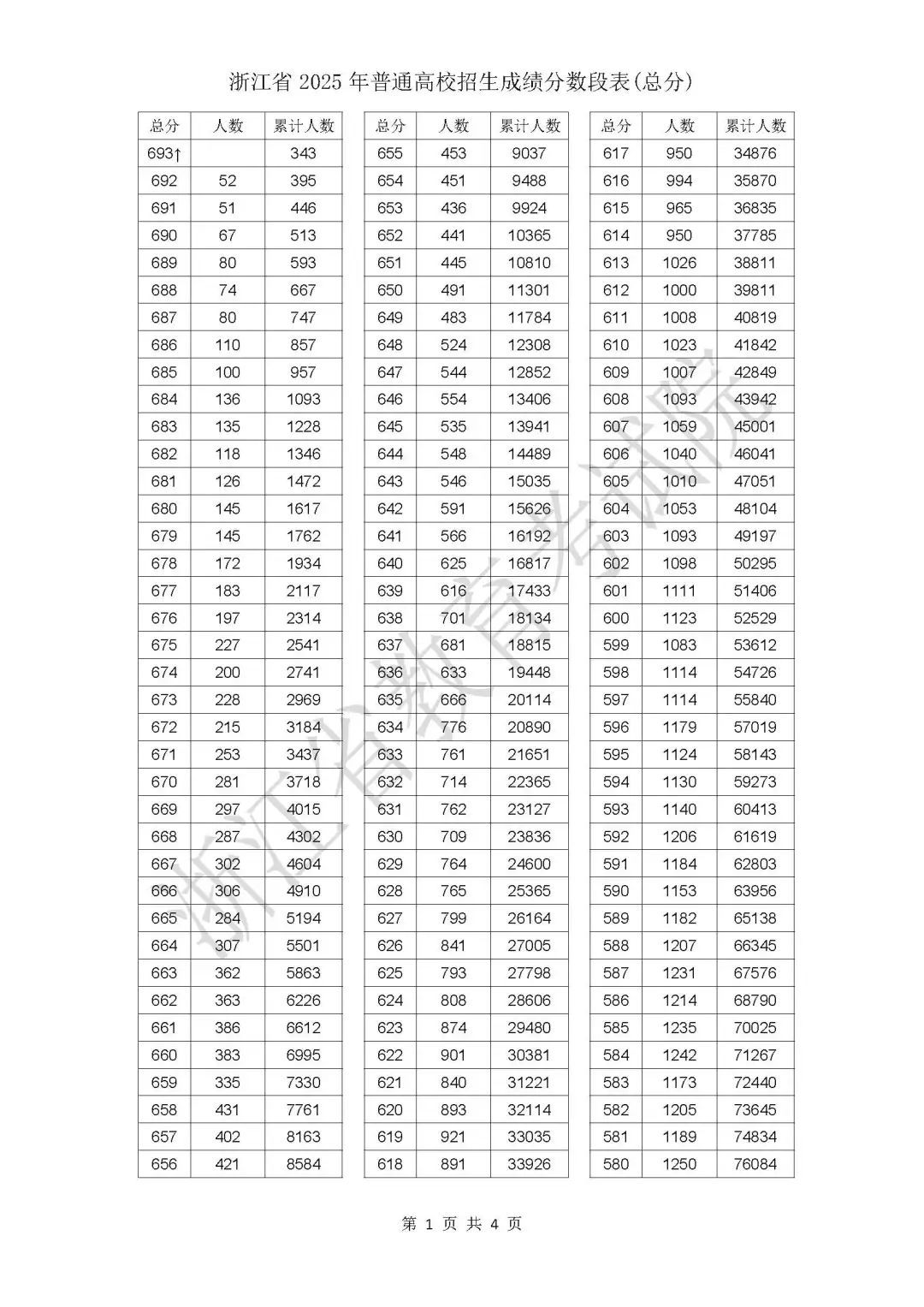 浙江省2025年普通高校招生考试成绩和各类别分数线发布后,高考各类别成绩(综合分)分数段表随即出炉。考生可结合成绩分布情况和自身位次信息,了解自己在同类别考生中的位置,作为志愿选择和定位的参考。